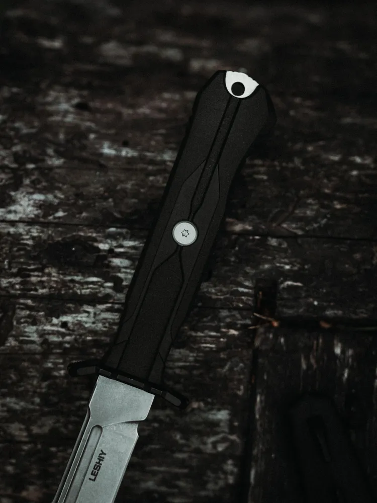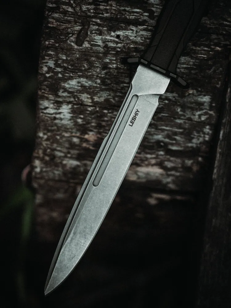 Рукоять «Лешего» отлита из эластрона, который зарекомендовал себя как прочный и надежный материал для военных и полевых ножей, полноценный широкий хвостовик проходит ее насквозь, выходя со стороны тыльника и образуя стеклобой. Широкая гарда обеспечивает надежное удержание при ударе в твердую преграду, даже в случае когда ладони пользователя влажные или липкие.
