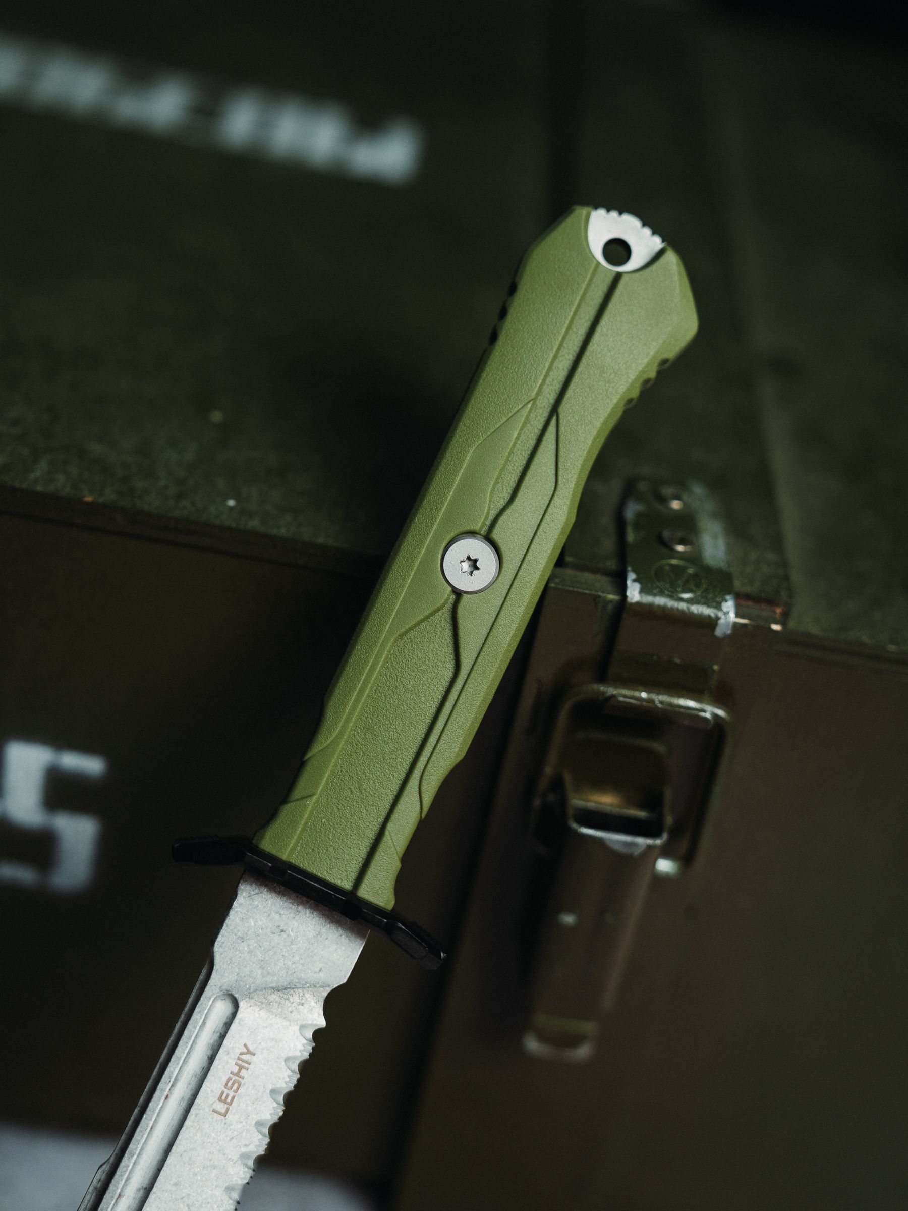 Нож «Леший» разработан в сотрудничестве с Вячеславом Корнеевым – ветераном 45-й отдельной гвардейской бригады специального назначения Воздушно-Десантных Войск России. и неоднократным участником боевых действий. Его позывной и стал названием этой серии ножей.