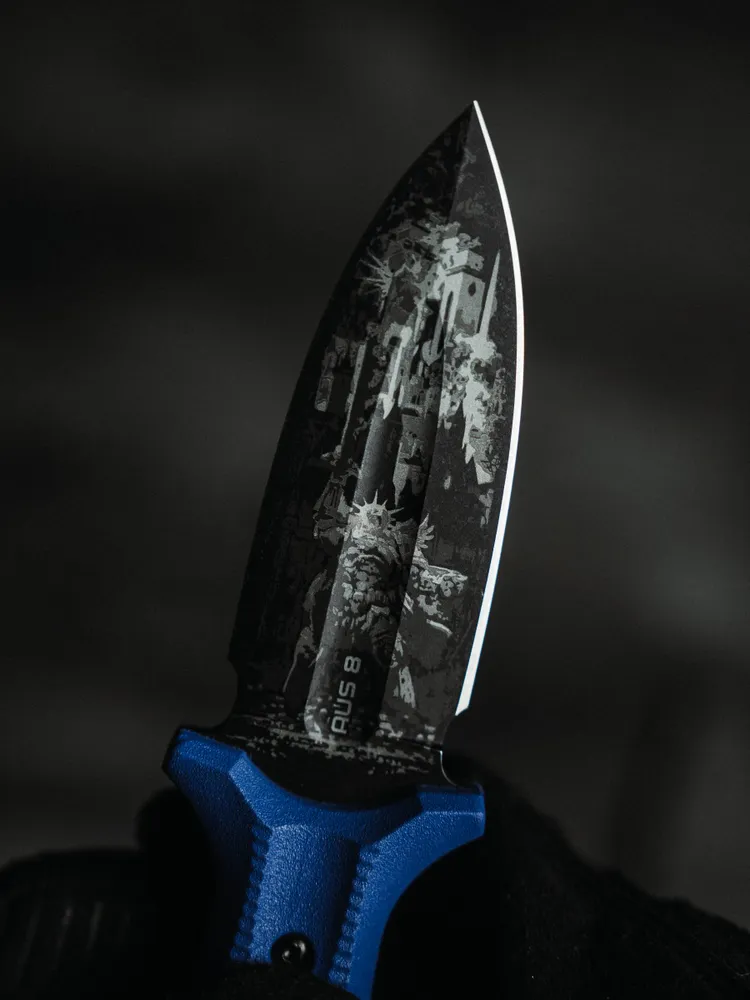 Клинок выполнен из стали AUS-8. Эта сталь разрабатывалась как ножевая, способная сохранить баланс между высокими нержавеющими и хорошими износоустойчивыми характеристиками. Одна из популярнейших ножевых марок сталей, так как легко поддается обработке, заточке и имеет хорошие режущие свойства.