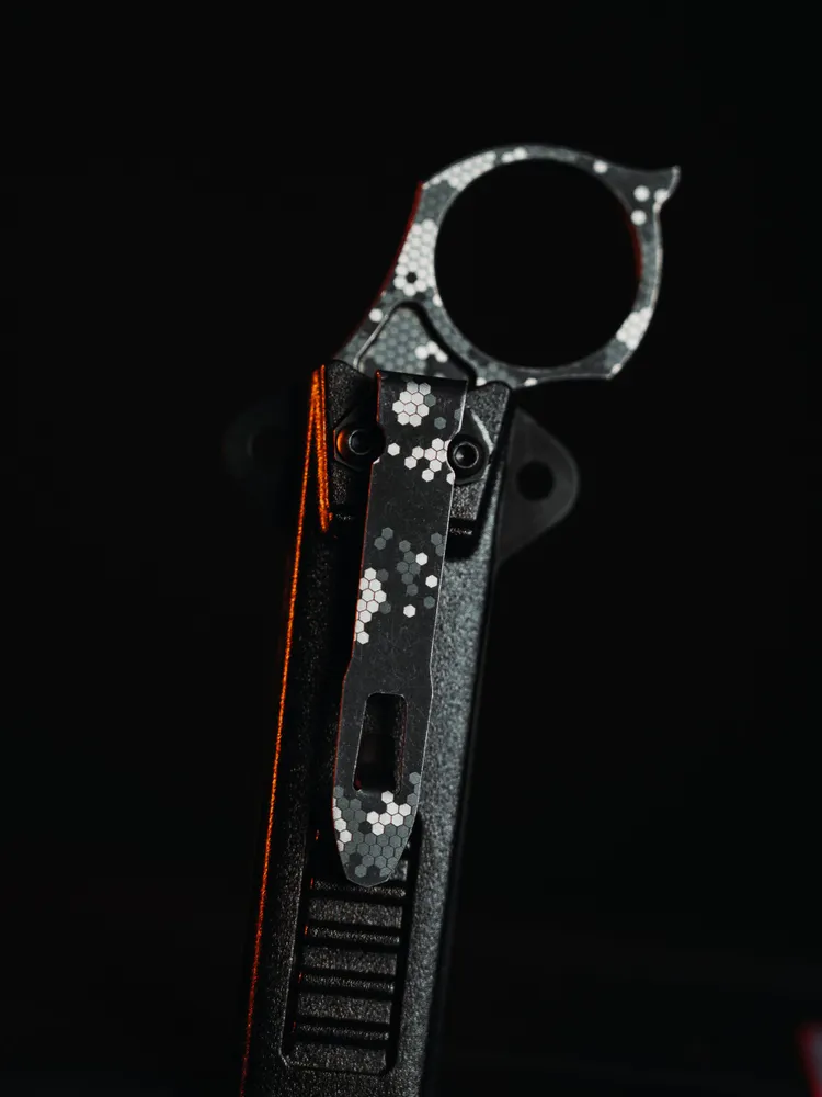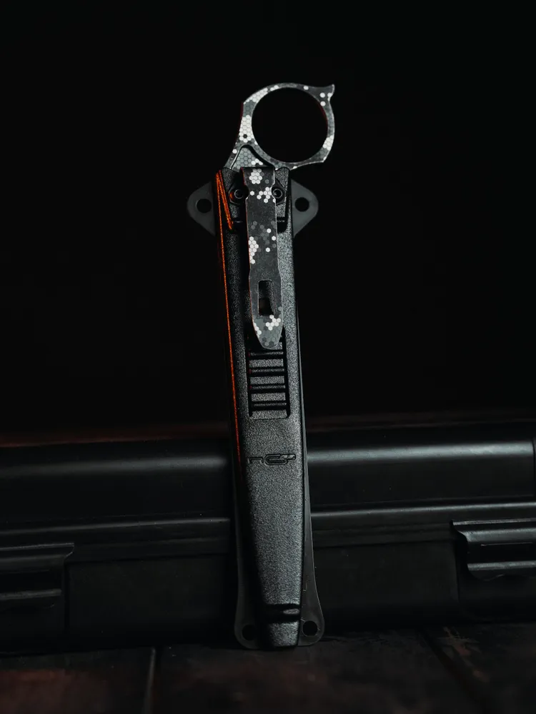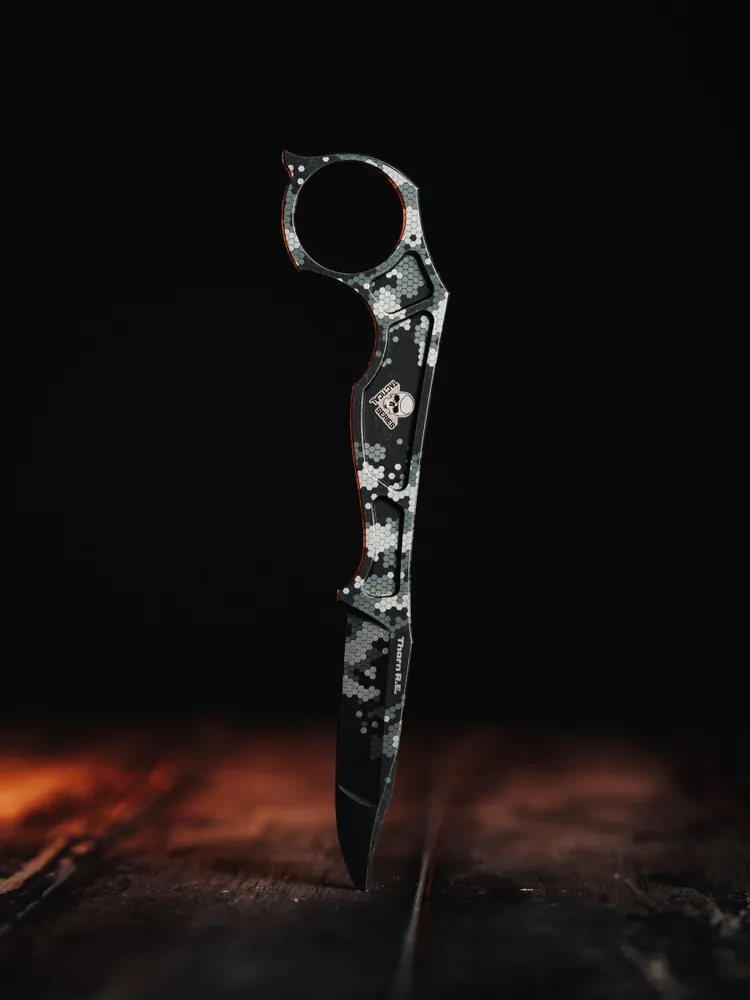 От Thorn первой модели версия Razvedos Edition отличается в первую очередь измененной формой рукояти. Как новый ее профиль с более выраженными упорами и подпальцевыми выемками, так и фрезерованные выборки на боковинах рукояти служат более уверенному удержанию ножа – неважно, голой рукой или в перчатке. Усиленный кончик клинка, унаследованный от модели Vendetta, обеспечивает повышенную прочность при пробивании различных материалов. Ну и конечно же новые ножны из литого пластика обладают повышенными прочностными характеристиками и лучше адаптированы для размещения на снаряжении как в стропах системы MOLLE, так и в произвольном месте.