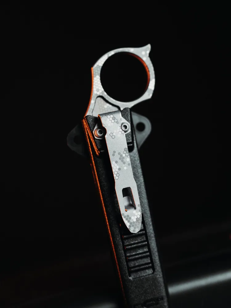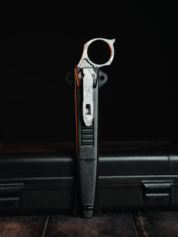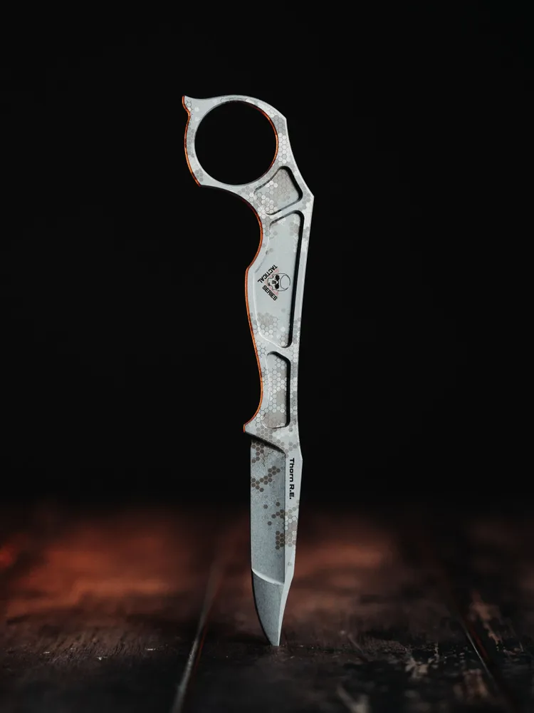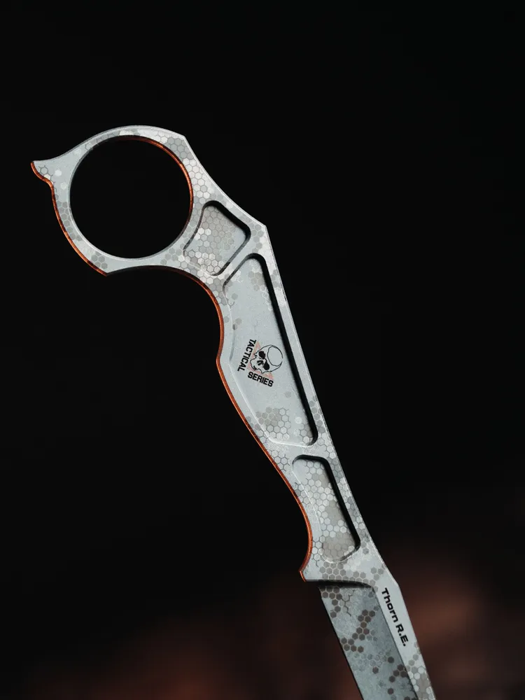 От Thorn первой модели версия Razvedos Edition отличается в первую очередь измененной формой рукояти. Как новый ее профиль с более выраженными упорами и подпальцевыми выемками, так и фрезерованные выборки на боковинах рукояти служат более уверенному удержанию ножа – неважно, голой рукой или в перчатке. Усиленный кончик клинка, унаследованный от модели Vendetta, обеспечивает повышенную прочность при пробивании различных материалов. Ну и конечно же новые ножны из литого пластика обладают повышенными прочностными характеристиками и лучше адаптированы для размещения на снаряжении как в стропах системы MOLLE, так и в произвольном месте.