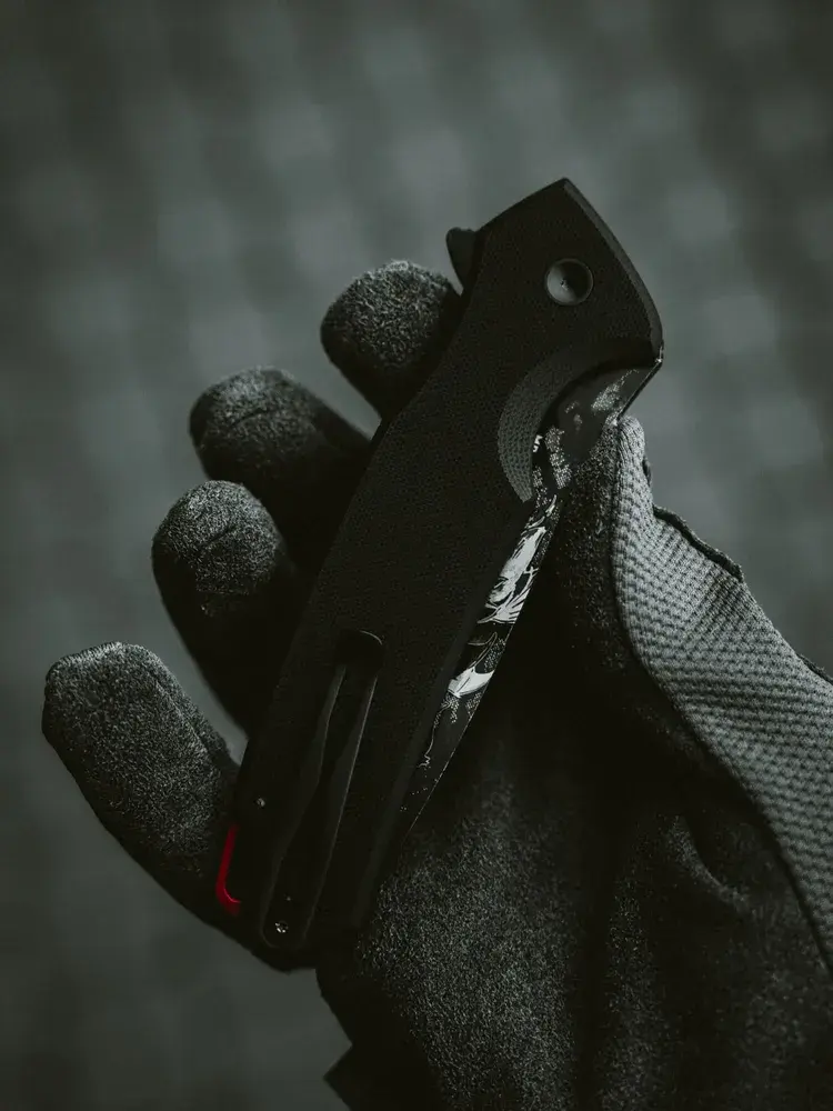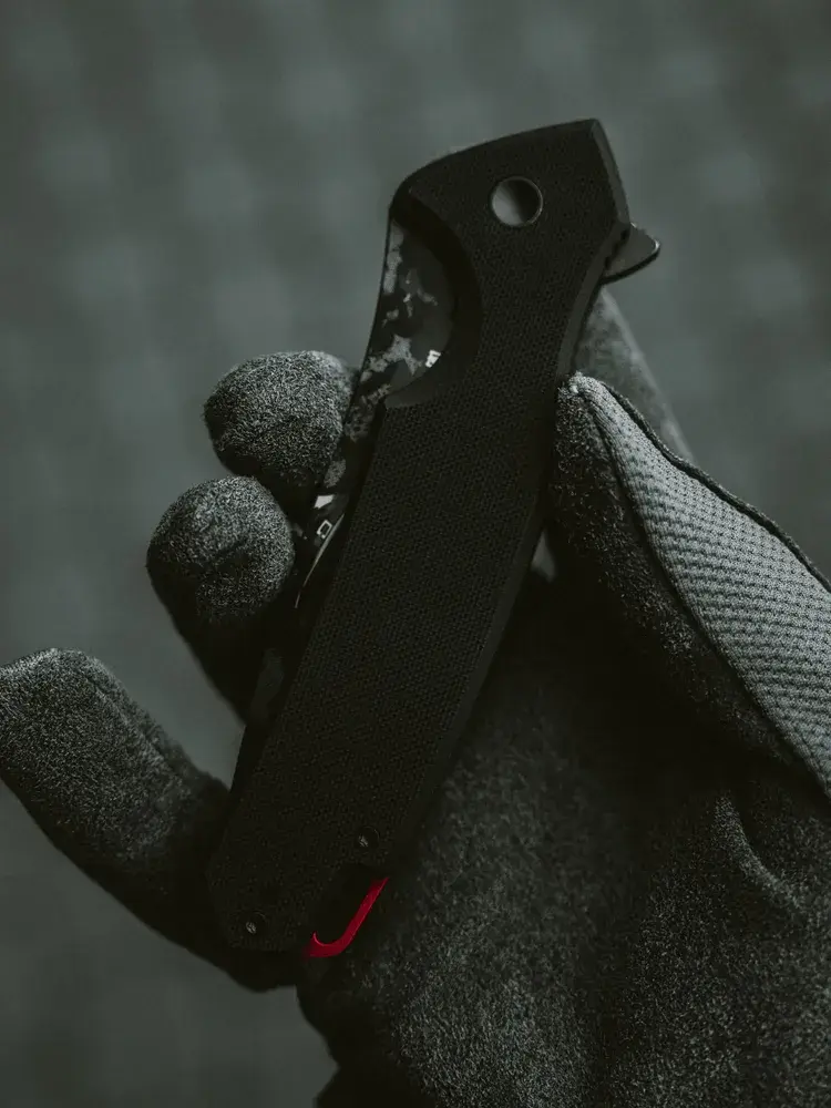 Рукоять выполнена из G10. Это композитный материал на основе стеклоткани и эпоксидной смолы. Он является очень прочным влагонепроницаемым и ударостойким. Прекрасно поддается обработке и окрашиванию. Используется повсеместно на всех современных ножах.