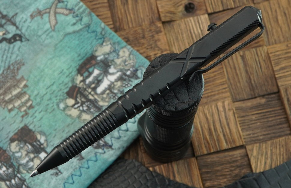 Рельефные насечки в месте хвата обеспечат надежное удержание ручки даже мокрыми руками, а узоры на корпусе придают ей стиля. Верхняя часть ручки оснащена упругой металлической клипсой, которая надежно удержит ручку в кармане, а выше расположился небольшой стеклобой из карбида вольфрама.