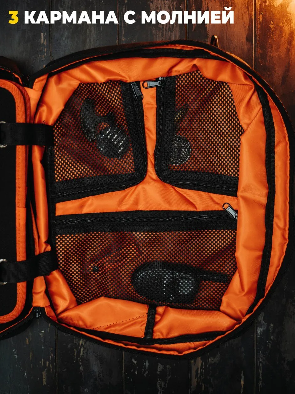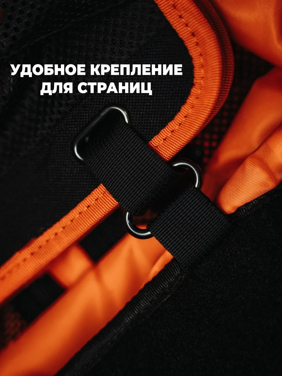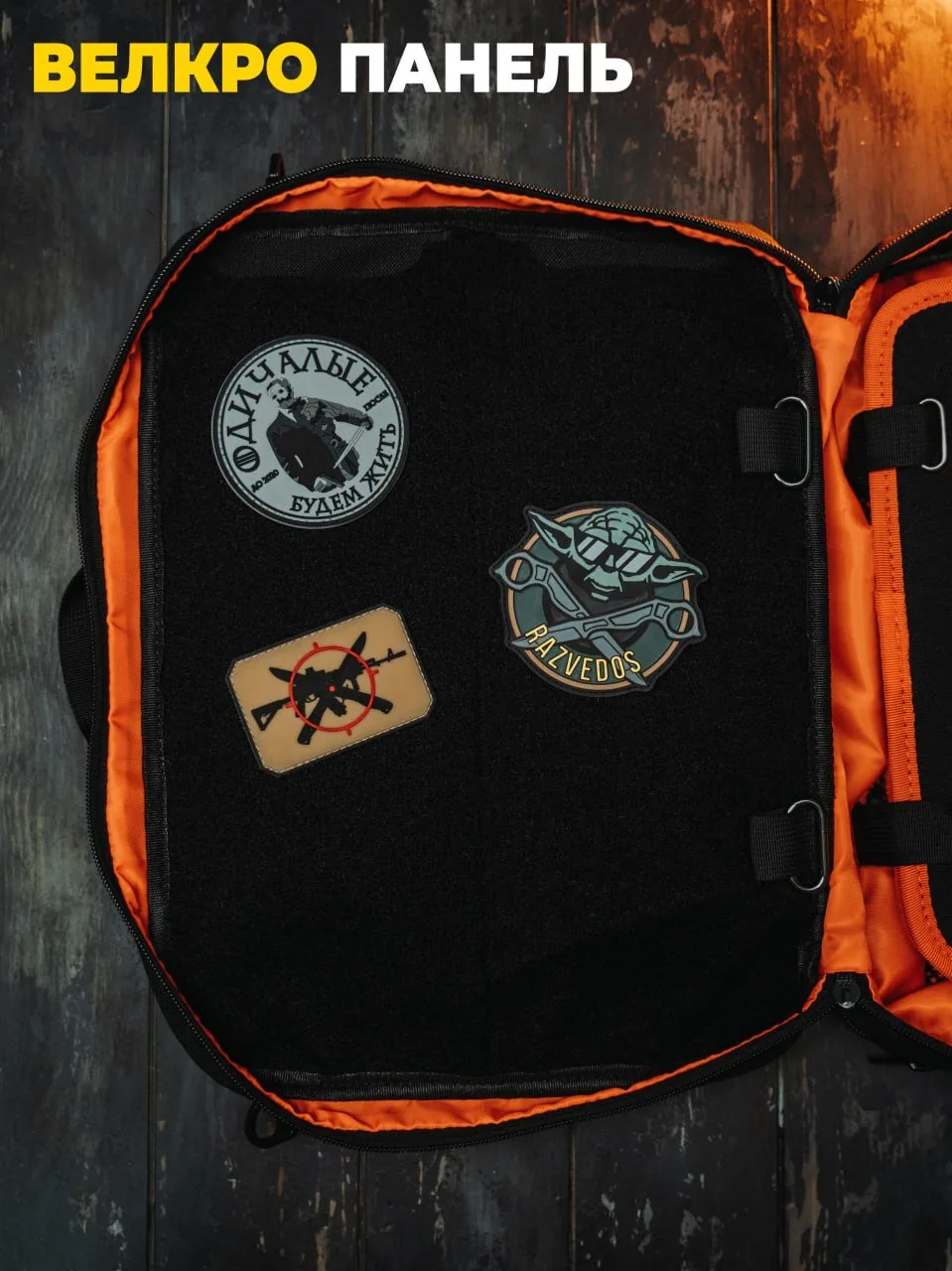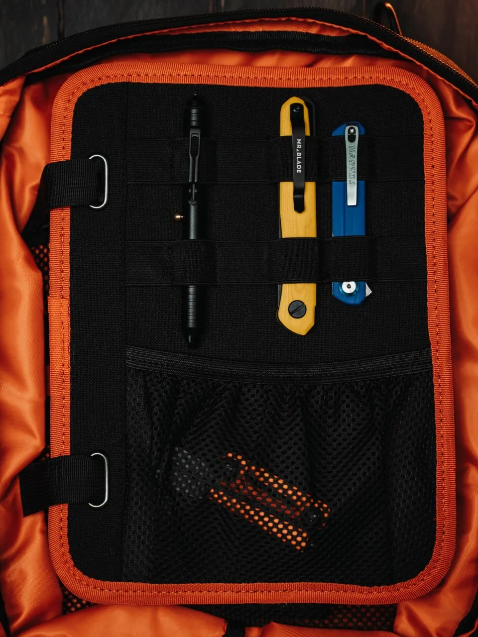 Внутри сумка разделена на несколько отделений, а также укомплектована четырьмя перекидными панелями, на которых имеются слоты для ножей, фонарей и ручек, образованные эластичной стропой, а также один сетчатый карман, позволяющий разместить в нем малогабаритные предметы. Во внутреннем отделении имеется еще одна поверхность велкро для размещения патчей, а под нею расположены два кармана для среднеразмерных фиксированных ножей. На задней поверхности внутреннего отделения имеются три сетчатых кармана на молнии.