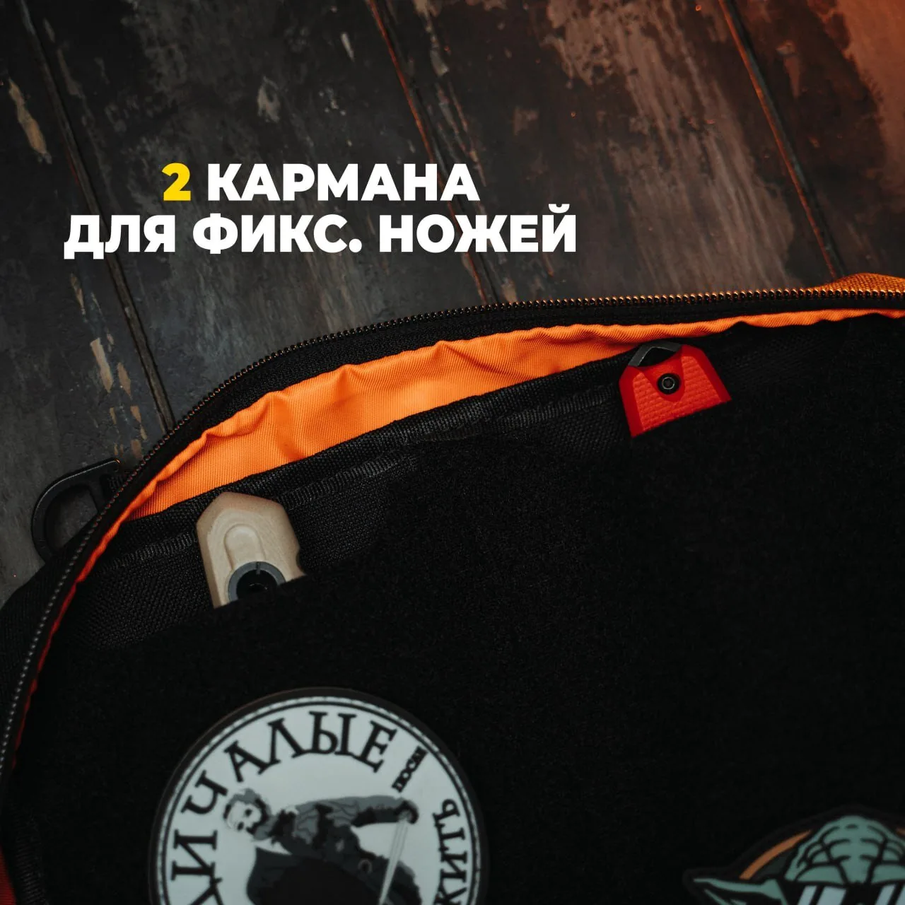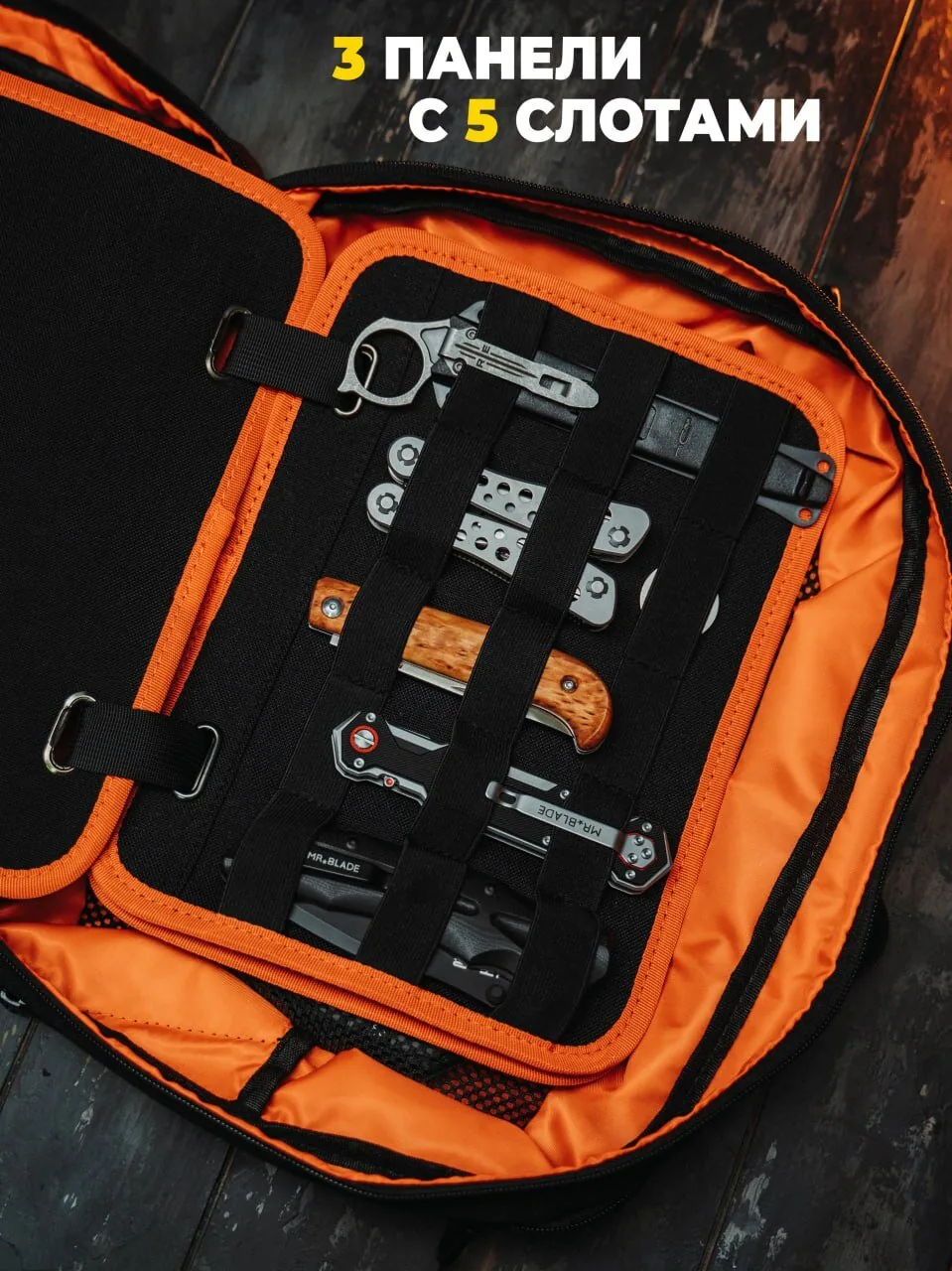 Эта большая сумка предназначена для хранения и переноски целой коллекции ножей, тактических ручек, фонарей, а также аксессуаров к ним и просто различных полезных вещей.