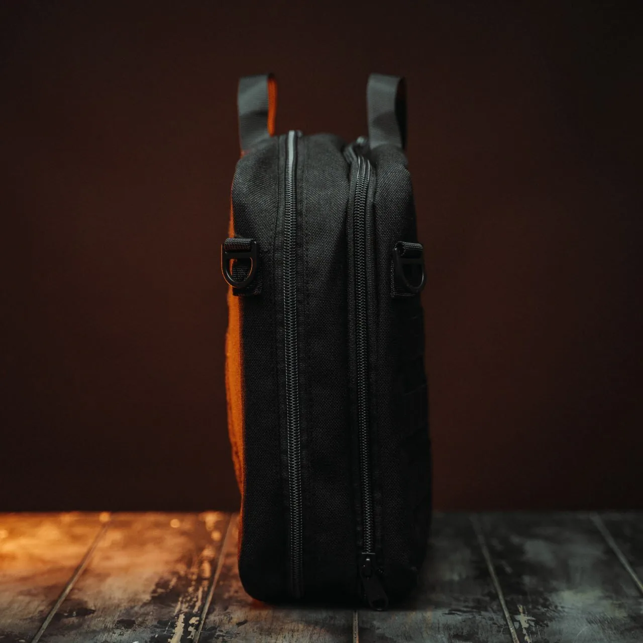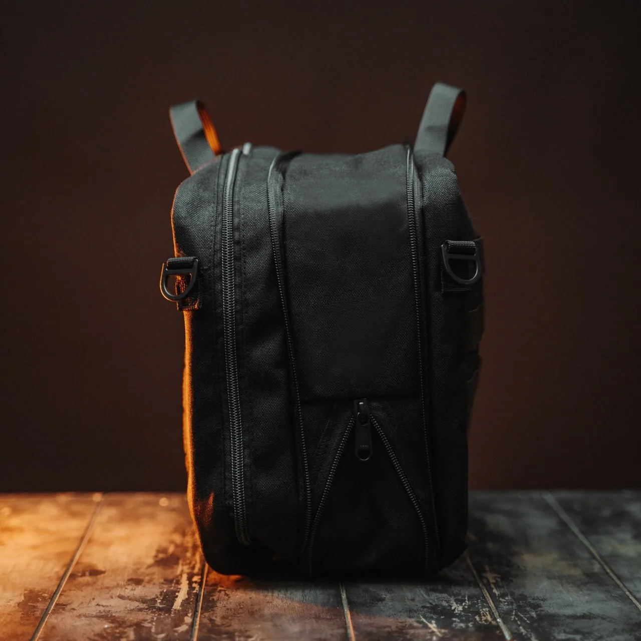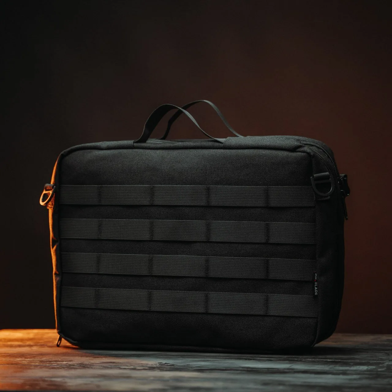 Сумка изготовлена из плотного нейлона, оснащена ручкой для переноски и ремнем для транспортировки на плече. На передней стенке сумки расположена панель M.O.L.L.E.-минус, на которой вы можете укрепить клипсы M.O.L.L.E., а также панель велкро, где могут расположиться патчи из вашей коллекции.