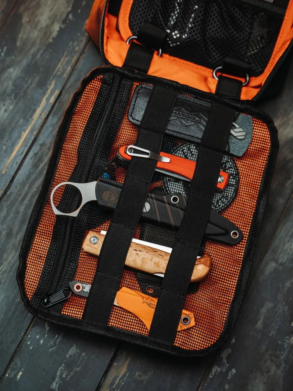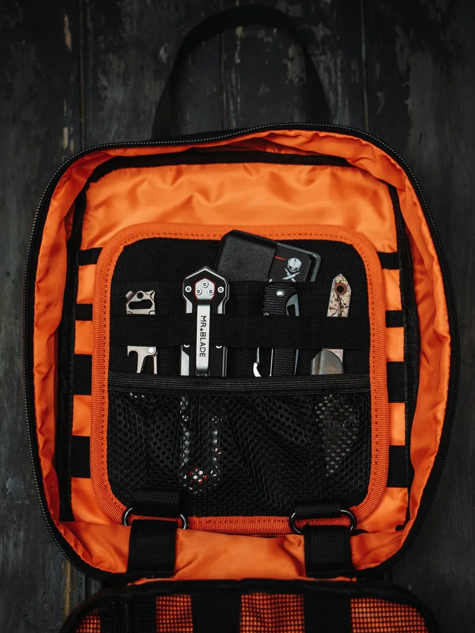 Внутри сумка разделена на несколько отделений, в ней имеются слоты для ножей, фонарей и ручек, образованные эластичной стропой, а также 1 сетчатый и 5 обычных карманов, позволяющих разместить в них малогабаритные предметы.