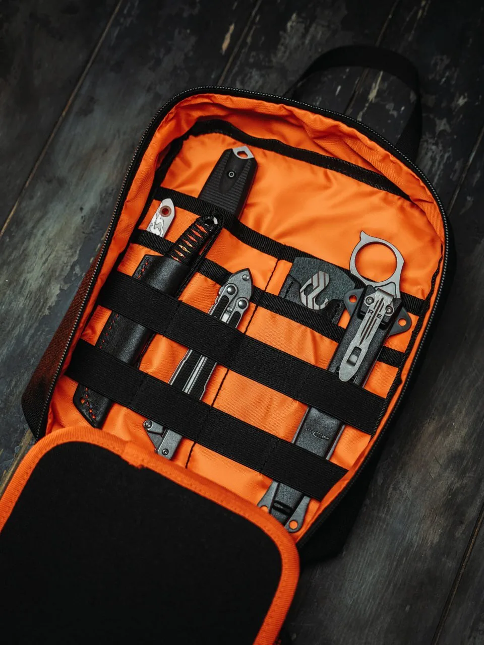 Эта сумка предназначена для хранения и переноски ножей, тактических ручек, фонарей, а также аксессуаров к ним и просто различных полезных вещей.