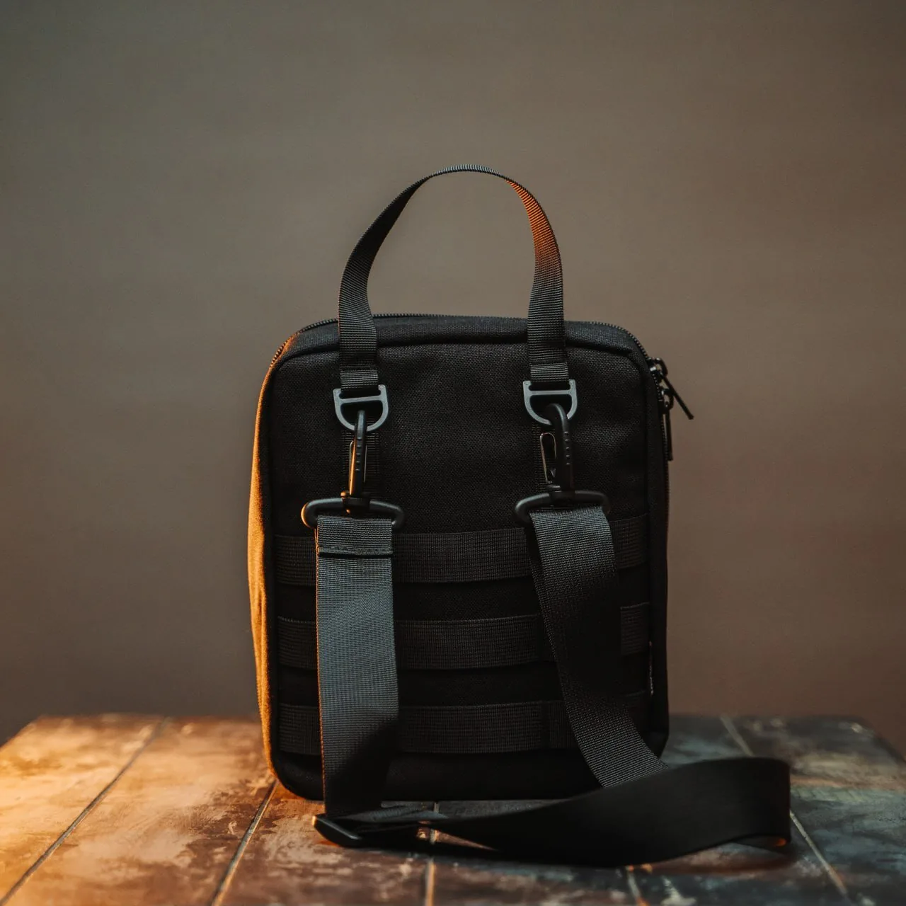 Сумка изготовлена из плотного нейлона, оснащена ручкой для переноски и ремнем для транспортировки на плече. На передней стенке сумки расположена панель M.O.L.L.E.-минус, на которой вы можете укрепить клипсы M.O.L.L.E., а также панель велкро, где могут расположиться патчи из вашей коллекции.